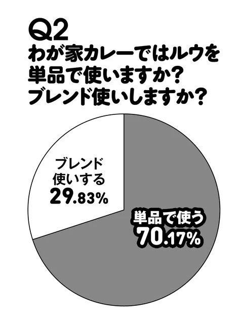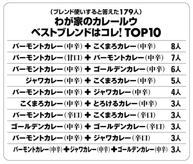 一方、ブレンド派の意見を見てみると、1位はバーモントカレー(中辛)+こくまろカレー(中辛)と単品人気の上位をブレンドしたもの。2位はバーモントカレー(甘口)+バーモントカレー(中辛)とバーモントの甘辛口を作り出すという意見。
