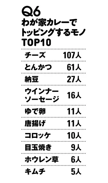 ちなみに、カレーのトッピングに関しては、1位がチーズで6人に1人が回答。2位はとんかつ。3位には好き嫌いの分かれそうな納豆がランクインするという少々意外な結果だった。