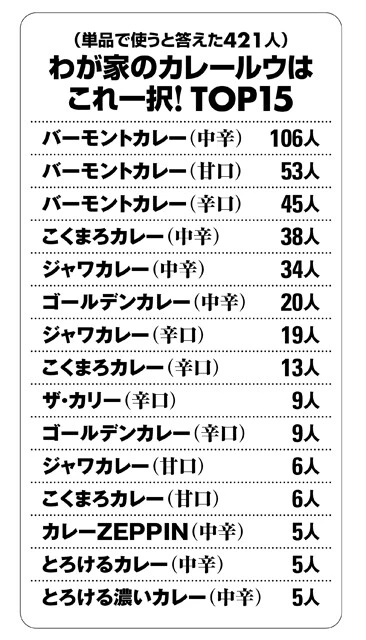 1種類使いの人気はバーモントカレーが中辛、甘口、辛口とワンツースリーを独占。4位のこくまろカレー(中辛)は「わが家のカレーはルウを混ぜ合わせて作っている」という声をヒントに開発されたようで、「コクのルウ」と「まろやかルウ」の2種類が、実はあらかじめブレンドされている商品なのだ。