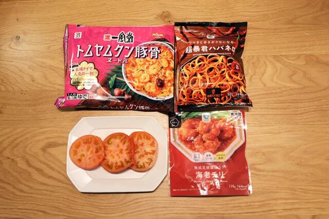 ・一風堂 トムヤムクン豚骨ヌードル(セブンプレミアム) 1個 ・ウマさと辛さがクセになる超暴君ハバネロ(ファミマル) 1袋 ・熟成豆板醤のコク海老チリ(ファミマル) 1パック ・トマトスライス 1個分