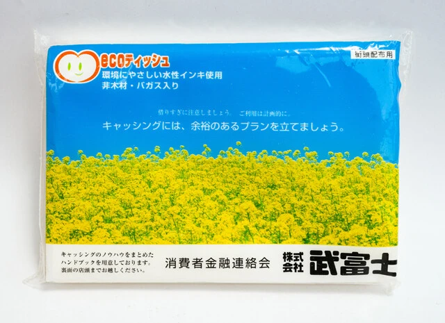 競合他社がデザインを頻繁に変える中、武富士は一貫してずっと菜の花畑デザインで配布し続けました。そのため、今でも誰もが思い出せる広告ティッシュとなったのです。
