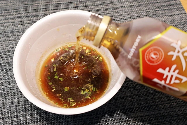 野島 次はどん兵衛天ぷらそばの冷やしを冷水ではなく、サントリーの特茶ほうじ茶で作るトクホどん兵衛です。ほうじ茶でどん兵衛を作るとうまみが増幅するし、スープも爽やかで抜群にウマくなるんですが、トクホ茶で作れば天ぷらやフライ麺を食べる罪悪感がゼロになります!