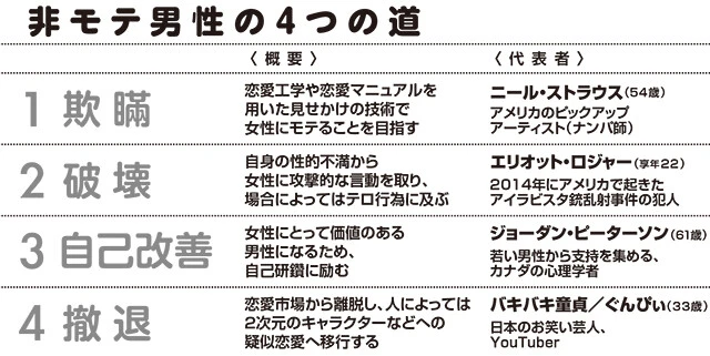 ――ところで博士の本では、非モテ男性が歩む4つの道が紹介されています。「欺瞞」「破壊」「自己改善」「撤退」の4つですが、これらはどういうものですか?