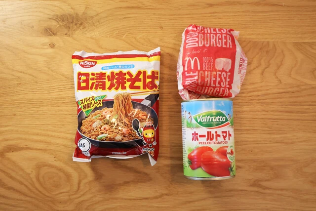 野島 そう見えてホールトマトは塩分ほぼゼロなんでしょっぱさに変わりなし。むしろトマトをガッツリ食えるのでヘルシーでもあります。あとは具がないのも寂しいのでマックのダブチの中身も添えますか。さあ助手くん、食ってみてくれ!