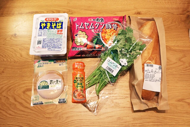 助手 フゴゴゴ!! 中身を挟みすぎてる上にフランスパンを使ってるから食感がハードでアゴが外れそうッス! あっ、でもすげえウメぇぞこれ! ペヤングがトムヤム風の酸味と辛みとココナツのまろやかさをパンとかハムに上手に伝えてる感じがするし、エビの風味も激ハマり。パクチーも合う! スープの再利用大成功ッスね!