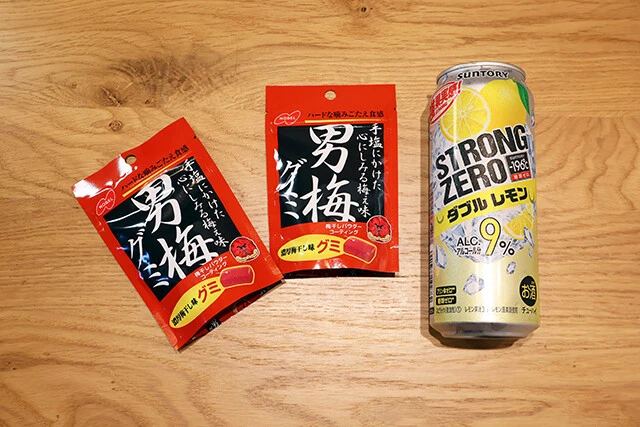 野島 ここからが本番。以前ネットでハリボーを酒に漬けると柔らかくなって激ウマ化するってのがはやったのを覚えてますか。今回はそのネタをヒントに、特大男梅グミをストロングゼロに漬けてみます。これで柔らかくなるし、味も塩+梅+レモンで激ウマ超確定!