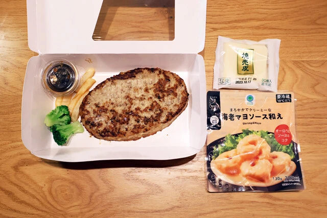 野島 あとびっくりドンキーのハンバーグといえばやっぱりトッピングですし、コンビニの海老マヨでも添えて海老しゅうまいにしますか。さあ、箸で持ち上げて豪快にかぶりつけ!