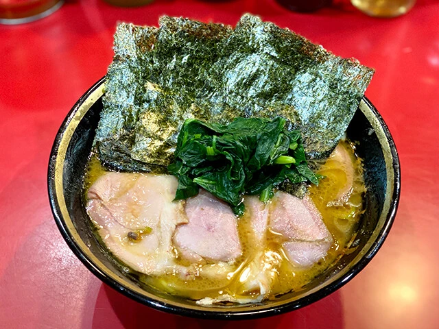 横浜「吉村家」を源流とする濃厚豚骨醤油ラーメン。平打ちのストレート麺と鶏油のアクセント、ホウレンソウ、チャーシュー、焼きのり3枚のトッピングが特徴。