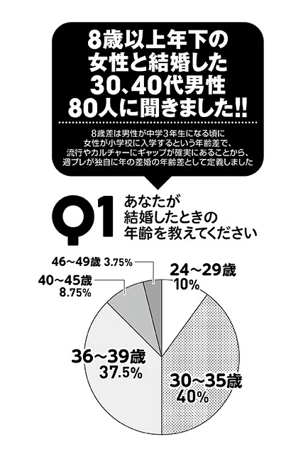 だが、〝年の差婚〟は芸能人に限った話にあらず。一般アンケートにて、30、40代で奥さんが8歳以上年下の男性は意外と多くいた!