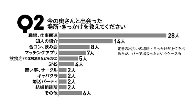 定番の出会いの場所・きっかけが上位を占めたが、バーで出会ったというケースも