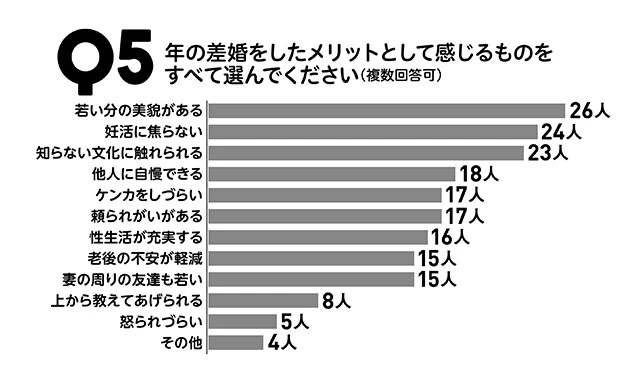 最後に、年の差婚ライフを楽しむ声、そして、まあ大変なこともあるよ、などの声をご紹介! アンケートの結果、年の差婚のメリットは1位「若さによる美貌」、2位「子づくりに焦らない」、3位「知らない文化に触れられる」という結果に。