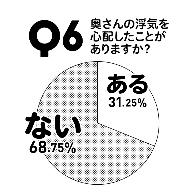 と、若く美しい妻ゆえの不安がついて回るという声も。だが、アンケートを見ると、浮気の心配を「したことがない」と答えた人が68.75%と多数を占めた。