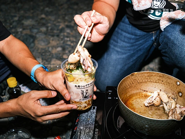 容器にフタをしてしっかりとシェイク! ドチャッ、ドチャッ、と重低音が相模川河川敷に響き渡る。薬味とつゆが全体に混ざったところで、いざ実食!