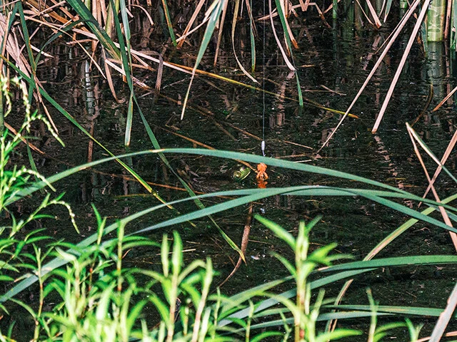 茸本は早速ハントを試みる。まずは釣り竿に疑似餌をセットし、ウシガエルの〝なんでも捕食する〟本能を刺激するように動かす。食いついたところを一気に釣り上げる作戦だ。
