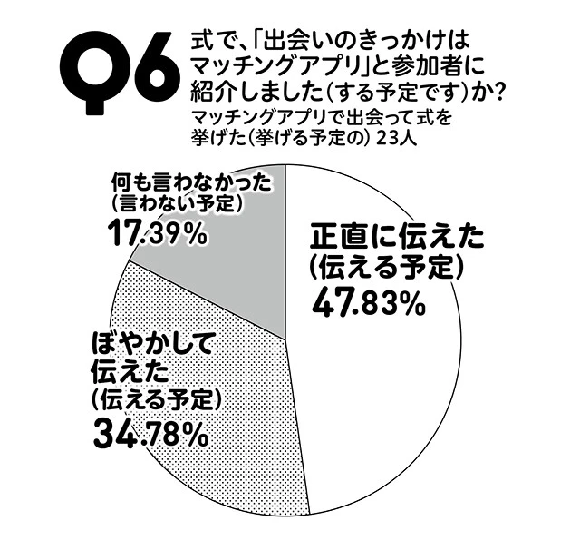 ちなみに、マッチングアプリで出会って、式を挙げた(挙げる予定の)23人に、結婚式では「出会いのきっかけはマッチングアプリ」だと正直に言ったか?を聞いたところ、半数以上が「ぼやかして伝えた」「何も言わなかった」という結果に。