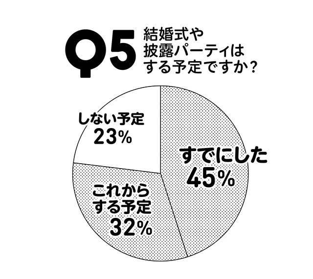 との声のように、コロナ禍で動きを自粛していたカップルが今年入籍して、一気に結婚式を挙げるケースが多いようだ。実際、アンケートでも、挙式・披露宴などの式やパーティをすでにした人が45%、これからする予定の人が32%と式への意欲の高さもうかがえる。