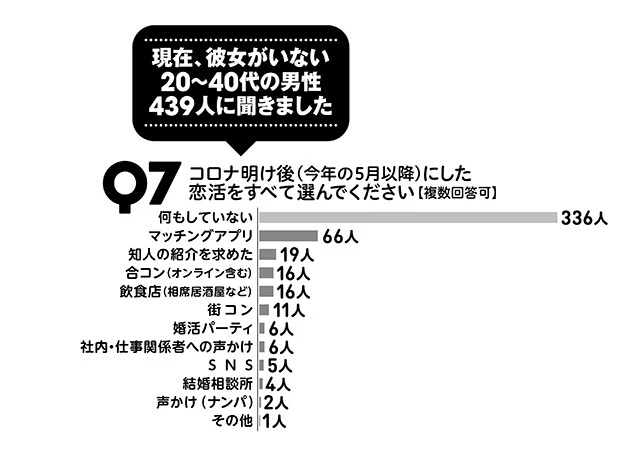 最後に、コロナ明け元年の出会いのトレンドも探るべく、現在、彼女がいない20~40代の男性439人に「今年、どんな恋活をしたか」とアンケートをとった。