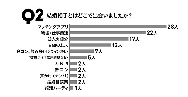 続いて、結婚相手との出会いの場所。定番の職場・仕事関連を抜いて、マッチングアプリが第1位に。こんな声が。