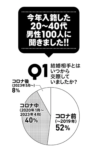 まずは、「結婚相手とはいつから交際していたか」。コロナ前からの交際が過半数とはいえ、今年5月以降に出会ってスピード婚した人が8%もいた。その中にはこんな声が。