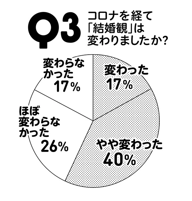 ところで、コロナは「結婚観」に変化を及ぼしたのか?。アンケートでは「変わった」「やや変わった」が57%と半数以上が変化を感じている。
