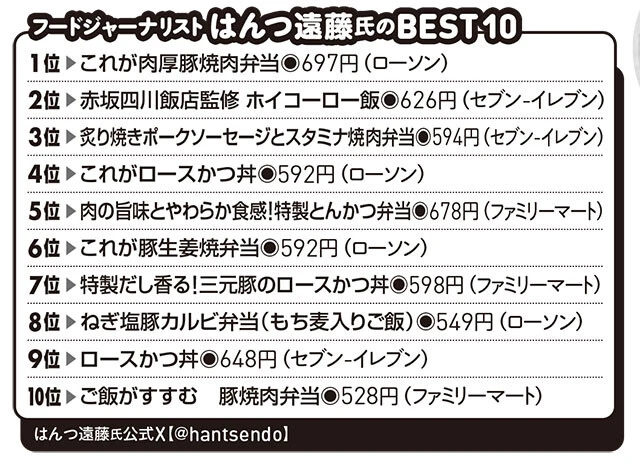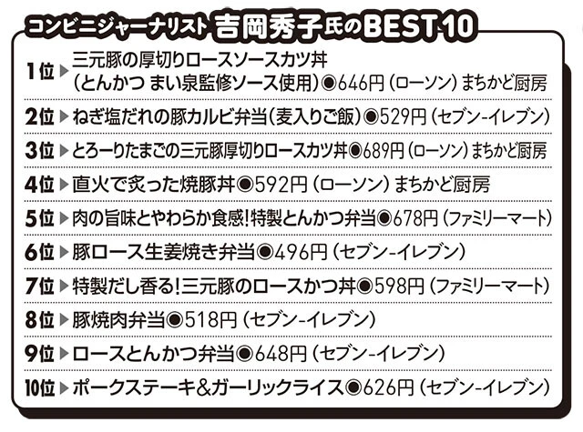 そこで、コンビニジャーナリストの吉岡秀子氏とフードジャーナリストのはんつ遠藤氏にオススメのコンビニ豚弁当を聞いて、それをもとに週プレ独自のランキングを作成した。
