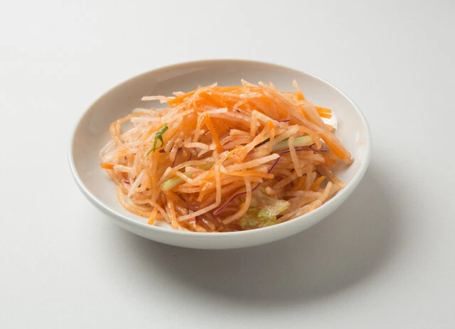 「シャキシャキ食感の大根サラダ(セブン-イレブン)の袋を開けて、ダイレクトにシラチャーソースとお好みでナンプラーを加え、袋の口を手で閉じて混ぜ合わさるように振る。揉むと水分が多く出るので、上下左右にザザ~ッと振り混ぜるだけで、ピリ辛サラダの完成です。
