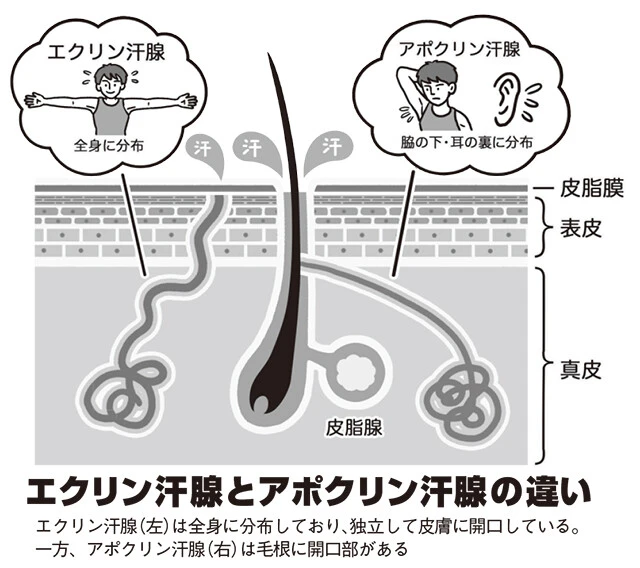 「もともと、ワキガは特定の汗と関係があることはわかっていました。汗を出す『汗腺』には全身にあるエクリン汗腺と、脇の下や陰部、耳の穴などにしか存在しないアポクリン汗腺との2種類があるのですが、後者がワキガを生むんですね。