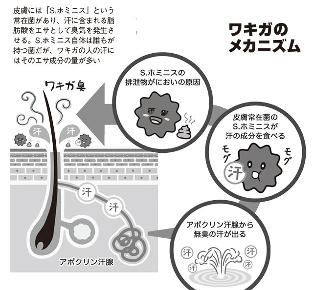 ただ、ワキガの詳しい仕組みはわかっていなかった。ところが私たちの研究でS.ホミニスという菌が主な原因だと突き止められました。アポクリン腺から分泌される汗そのものは無臭なのですが、S.ホミニスが汗に含まれる化合物を『食べて』排出する、いわば排泄物がにおいの原因なんです」