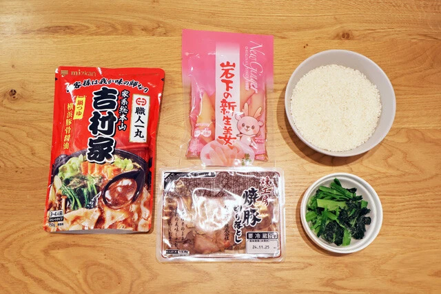 (1)切る! まずは具材の下準備。岩下の新生姜は細切りにし、焼き豚はひと口サイズにカット。冷凍ホウレンソウはそのままで構わない。その他具材にはうずらのゆで卵もオススメだ