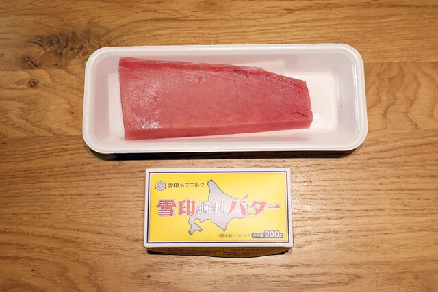 野島 ぎゃん! マジで大成功だ! ちょっと溶け始めたくらいのバターの塊とマグロを同時に食べるとムニッとした食感とともにバターの風味が口の中で爆発する感じが最高すぎる!