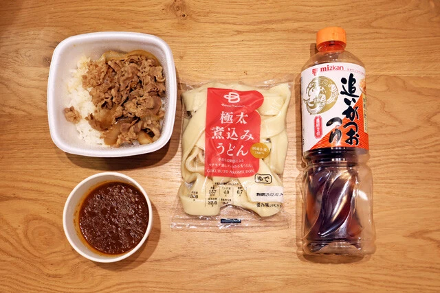 野島 仕方ない。そしたら希釈しためんつゆを鍋で加熱し、そこに牛魯珈カレーの牛肉を入れましょう。で、ここになるべく太麺のうどんを入れて煮込みます。今回はスーパーで一番太いゆでうどんを買って使いましたが、冷凍うどんでもOK!