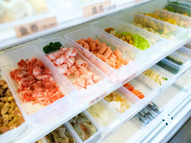 Pooちゃん どこの店も容器内の食材は肉も野菜も100g単位で300~400円前後。で、レジ前のスケールで重さを量って、料金は前払いだな。