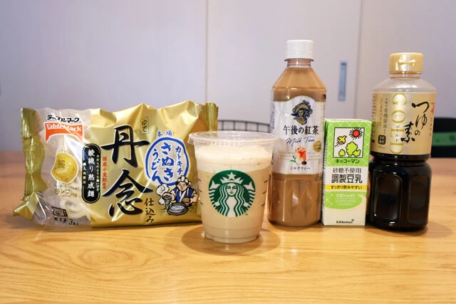 (3)紅茶! (2)をスタバの空き容器に半分ほど移し、午後の紅茶 ミルクティーと氷を適量入れれば出来上がり。うどんの塩気がミルクティーの甘みを程よく引き立て飲みやすいおいしさに!