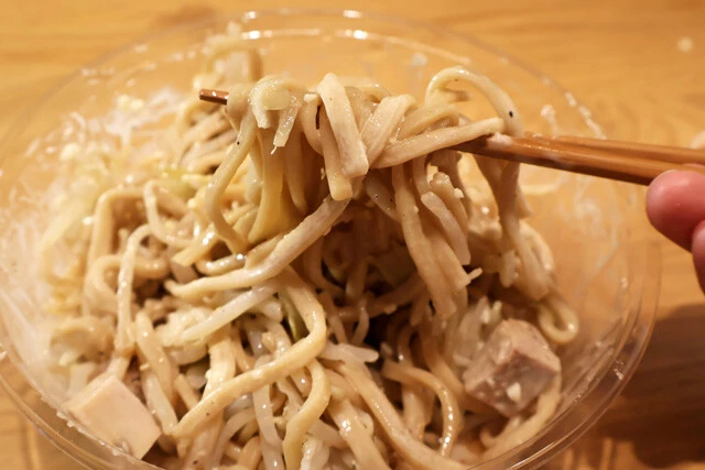 二郎インスパイア系の冷やしまぜそば。極太ワシワシ麺は硬さもあって雰囲気バッチリ。タレはブタとにんにくのウマみで厚みがあり、アブラ要素をマヨで補完するアイデアも見事!