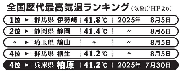 今年7月30日。兵庫県丹波市柏原町で気温41.2℃が観測され、国内の観測史上最高気温を更新した。丹波市の人口は約5万9000人。最高気温を出した柏原町の人口は約9700人と小さな町で、これまで最高気温などで名前が挙がったこともなかったが、急に日本一になってしまった。
