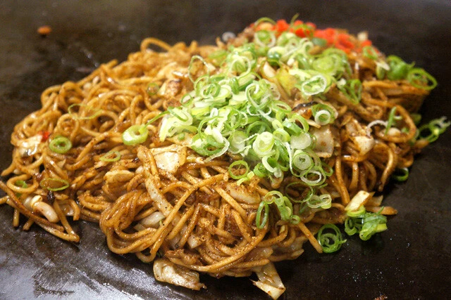 ところで、まんぼ焼きとはどういうものかというと、そもそも京都には、薄い小麦粉の生地の上にキャベツやホルモンをのせて焼く「べた焼き」という、お好み焼きの一種のようなご当地メニューがあるそう。これに麺や独自の具材を加えたこの店のオリジナルが、まんぼ焼き。全部入りの具材は、肉、いか、油かす、ホルモン、玉子、ねぎ、焼きそばまたはうどんと、とても豪華だ。