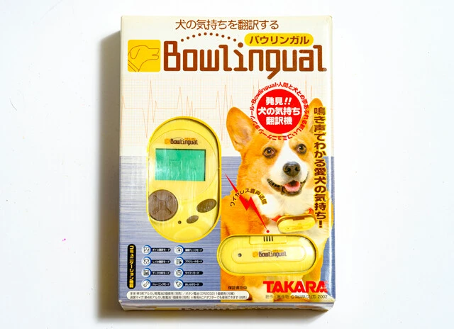 2002年にタカラ(現タカラトミー)から発売されたバウリンガルは、犬の鳴き声を読み取って何を伝えたいのか教えてくれる電子玩具。ケーブルが絡まる危険のないワイヤレスのマイクを犬の首輪に装着し、そこで拾った鳴き声を本体で受信し、犬語を日本語に翻訳して液晶画面に表示します。