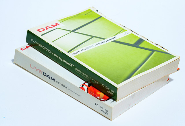 レーザーカラオケの目次本。どのディスクの何曲目かという情報から人が探して再生する時代から、曲数は限られるがオートチェンジャーをリモコン操作できる時代になった