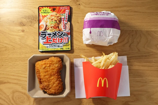 (4)バーガー! 意外な相性を発揮するのがてりやきマックバーガー。こちらも紙袋に投入し、粉を入れたら豪快に振る。マヨネーズやてりやきソースの醤油がニンニク背脂風味と完璧にマッチ!