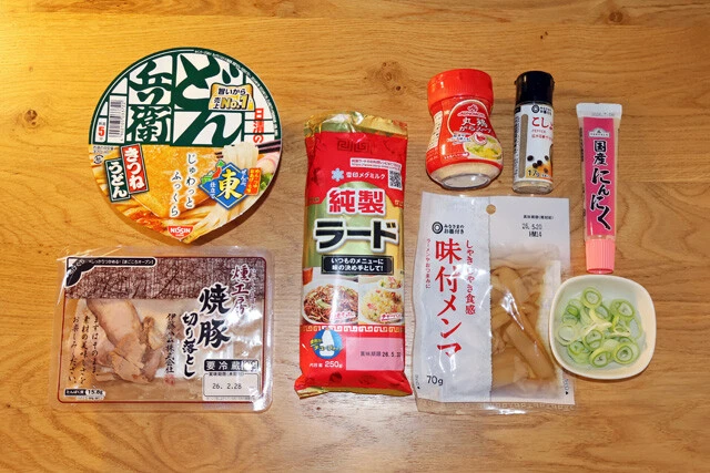 (2)調味料! 粉末スープと一緒に鶏ガラスープの素、ラード、ニンニクチューブを投入。かなりパンチの利いた味になるが、濃かったら薄めればOK。特にラードと鶏ガラはガッツリ入れよう