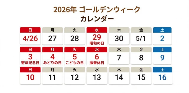 2026年のGWは、5月2日(土)から5月6日(水・振替休日)までの5連休が基本の形となる。