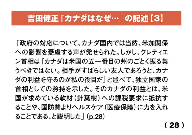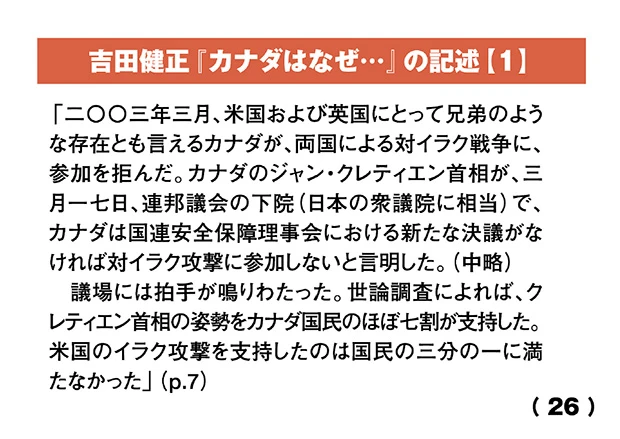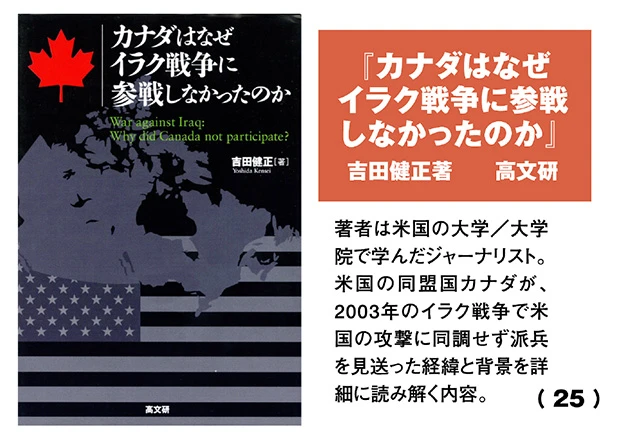 また、吉田健正氏の著書『カナダはなぜイラク戦争に参戦しなかったのか』には、カナダがアメリカの北に隣接する、文化的にも経済的にも軍事的にも繋がりの深い同盟国であるにも関わらず、国連安全保障理事会の決議なしにはイラク攻撃に参加しなかったことや、カナダ国防法に基づき、派兵を見送った経緯と背景が詳細に書かれています。