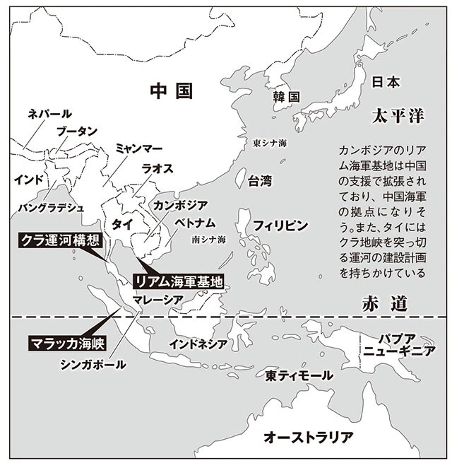 カンボジアのリアム海軍基地は中国の支援で拡張されており、中国海軍の拠点になりそう。また、タイにはクラ地峡を突っ切る運河の建設計画を持ちかけている