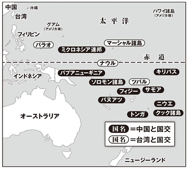 太平洋諸国でもかつては台湾と国交を結ぶ国が優勢だったが、中国が経済進出で切り崩し、残るはわずか4ヵ国。赤道より南ではツバルだけだ。中国は5月末、国交のある10ヵ国に集団安保協定を呼びかけたが、ミクロネシア連邦の反対で締結は見送られた