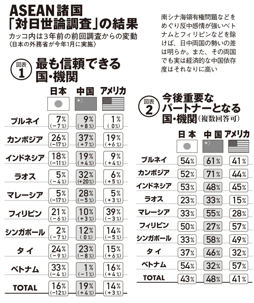 これは今年1月に日本の外務省が実施し、5月末に公表された、ASEAN(東南アジア諸国連合)加盟9ヵ国の世論調査の結果だ(図表1参照、政情不安のミャンマーは対象外)。経済力や軍事力ではなく、人々の「信頼」で負けたとなると、衝撃を受ける日本人も多いのではないだろうか?