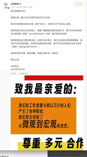 中国最大のLGBTQ組織「北京同志中心(北京LGBTセンター)」は5月15日、中国のSNS「ウェイボー(微博)」公式アカウントで活動停止を発表した。「いつも北京同志中心への関心と支援に感謝いたします。残念ながら不可抗力のため、本日をもって北京同志中心の運営を終了することをお知らせいたします」という告知とともに、寄付金の返金方法が説明された。