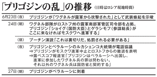 ロシアの民間軍事会社(PMC)ワグネル・グループの創設者エフゲニー・プリゴジンによる〝反乱〟。結果的にワグネルとロシア正規軍や治安部隊との正面衝突は回避され、約24時間でカタがついた形だが、重武装の傭兵部隊が首都モスクワから約200㎞の地点までいとも簡単に進軍したことも含め、内外に与えた衝撃は大きかった。