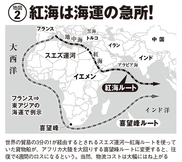 このリスクを回避するため、石油大手シェルなど多くのグローバル企業が海上輸送ルートを変更。IMF(国際通貨基金)の推計によれば紅海と地中海を結ぶスエズ運河を通航する船舶は約40%減少し(1月1日~16日)、テスラやボルボは部品不足で自動車生産の一時停止を余儀なくされた。
