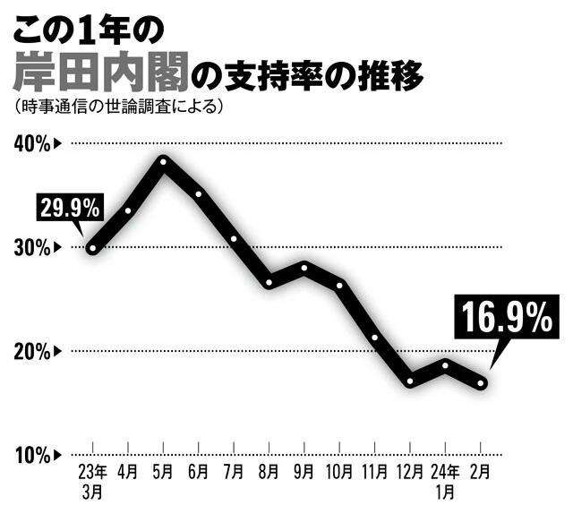 その影響か、2月の時事通信の調査では、岸田文雄内閣の支持率は16.9%、自民党の支持率も16.3%と急落。内閣支持率は、2012年の自民党政権復帰後で最低だ。