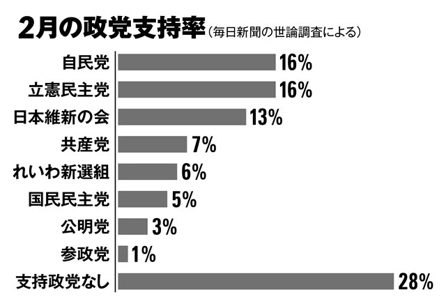 また、毎日新聞の調査では、自民党と立憲民主党の支持率が共に16%で、日本維新の会が13%、れいわ新選組が6%、国民民主党が5%などと野党の支持率が急上昇。